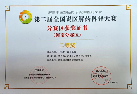 2024年1月份全国说医解药科普大赛河南分赛区中,在中医社的组织下,赵玉平老师指导的 23 级中医学二班刘天恩团队的优秀作品“一味萝卜浑身是宝”荣获了省级二等奖。
